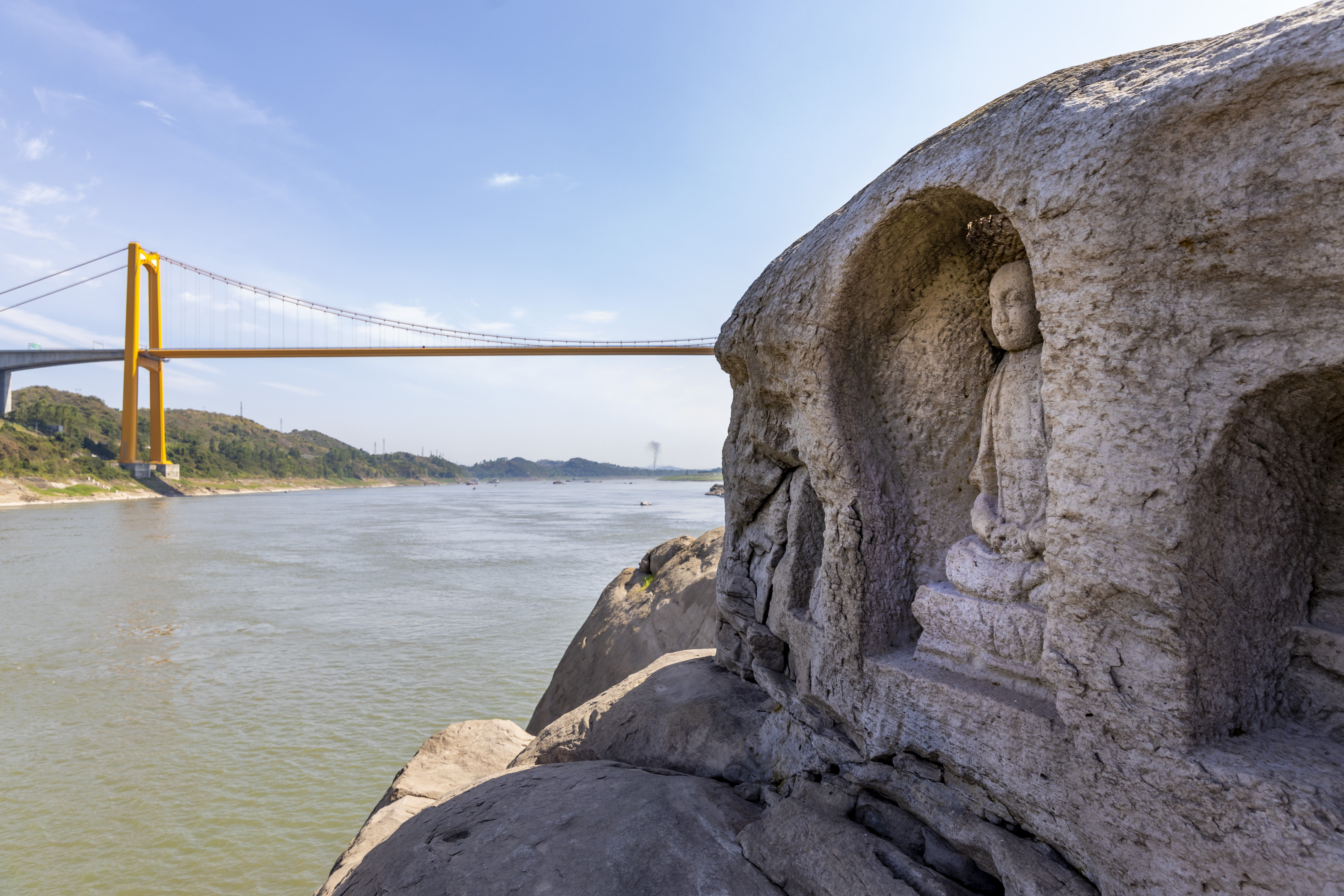 造像位于长江江心岛礁上。