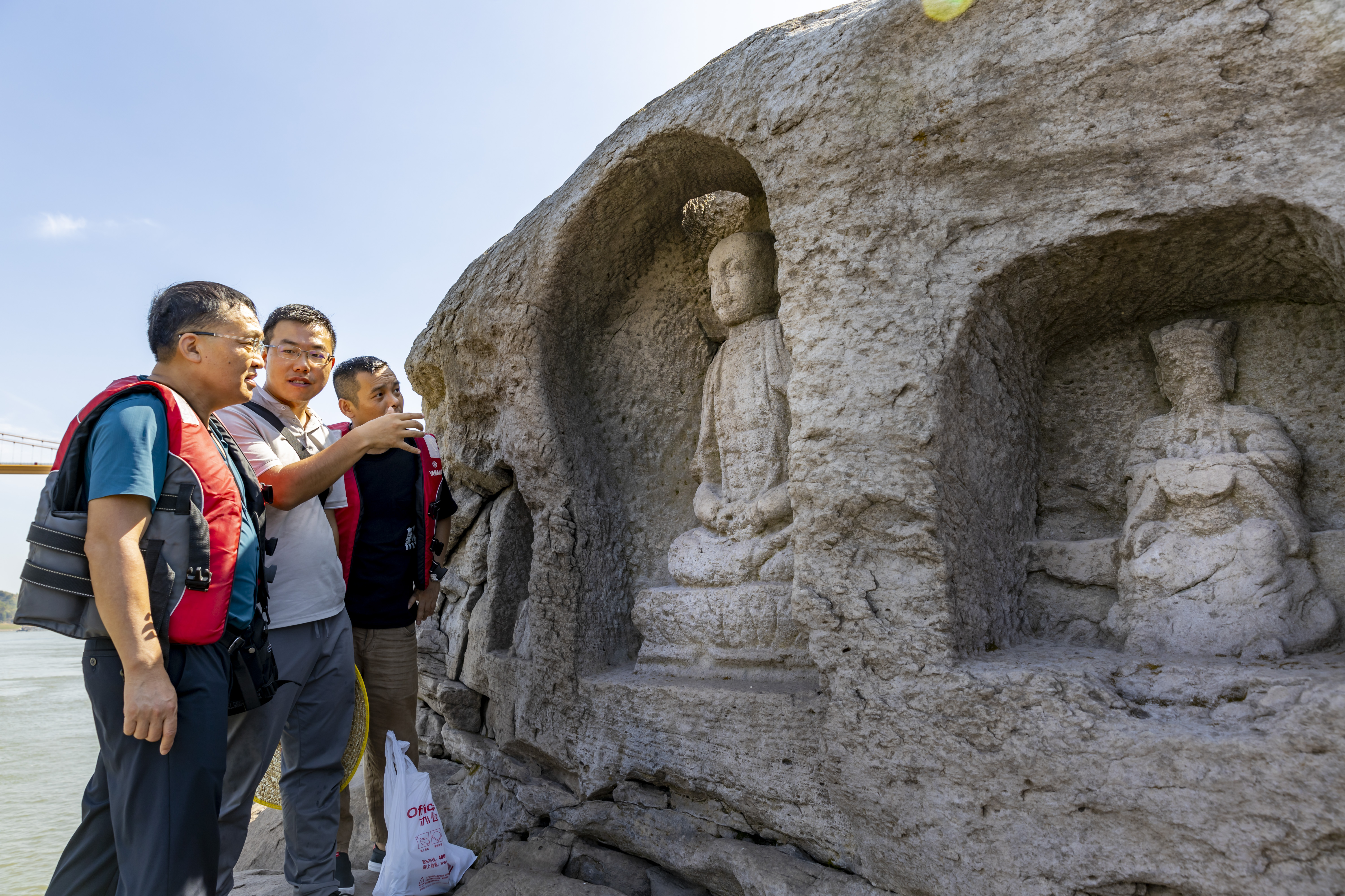 据了解,这3龛摩崖造像,初次被发现于2022年8月。那时受抓续高温影响,长江水位下落赫然,这处长年并吞于水下的造像得以涌现江面。