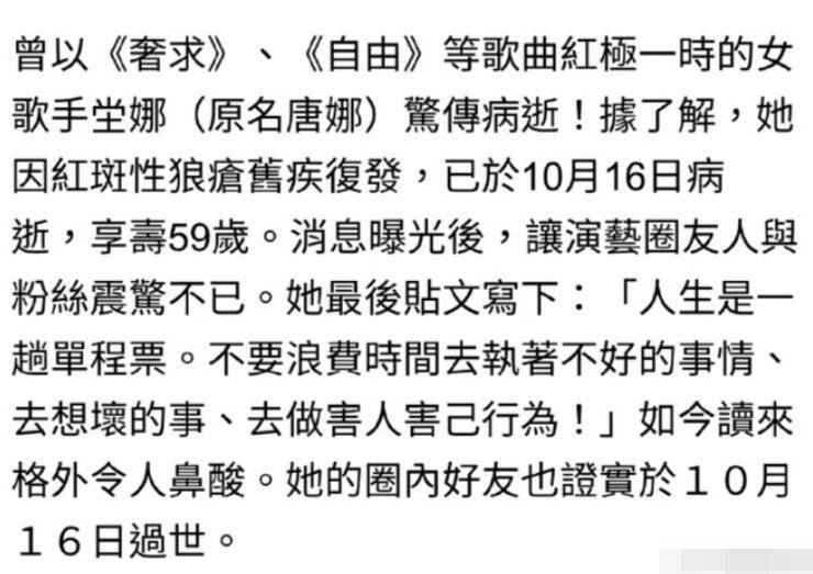 据台媒报谈,中国台湾女歌手坣娜疑似因红斑狼疮于16日病逝,享年59岁,该音问已被好友证据。