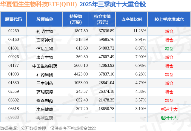 从基金范围来看,中原恒生生物科技ETF(QDII)基金2025年三季度公布的基金范围为60.23亿元,较上一期范围43.05亿元变化了17.18亿元,环比变化了39.91%。该基金最新一期钞票成就为:股票占净值比98.03%,无债券类钞票,现款占净值比0.69%。从基金合手仓来看,该基金当季前十大股票仓位达67.11%,第一大重仓股为药明生物(02269),合手仓占比为11.23%。